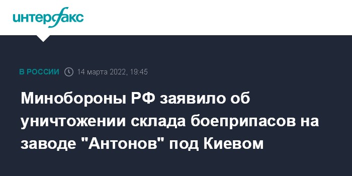 Москва. 14 марта. INTERFAX.RU - Российские военные уничтожили крупный склад боеприпасов к реактивным системам залпового огня на территории завода "Антонов" вблизи Киева, сообщил официальный представитель министерства обороны РФ Игорь Конашенков на брифинге в понедельник.