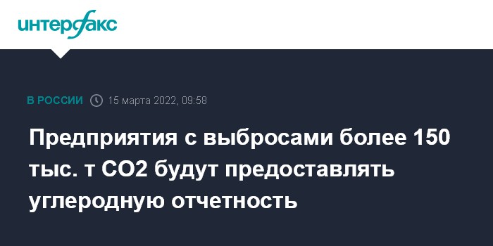 Москва. 15 марта. INTERFAX.RU - Крупные промышленные предприятия с выбросами парниковых газов, эквивалентными более чем 150 тысяч тонн углекислого газа в год, теперь будут относиться к регулируемым государством организациям и предоставлять углеродную отчётность. Постановление об этом подписал председатель правительства Михаил Мишустин, сообщила пресс-служба правительства.