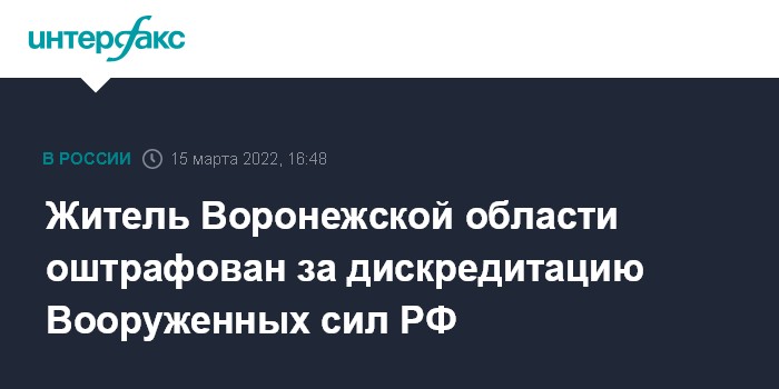 Москва. 15 марта. INTERFAX.RU - Панинский районный суд Воронежской области привлек к административной ответственности 38-летнего местного жителя, признав его виновным в дискредитации Вооруженных сил РФ, сообщает пресс-служба ГУ МВД России по региону.