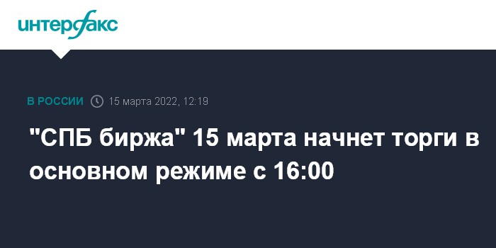 Москва. 15 марта. INTERFAX.RU - "СПБ биржа" сообщила, что 15 марта начнет торги в режиме основных торгов в 16:00 мск, сообщается в пресс-релизе биржи. Это время связано с началом торгов на международных площадках.