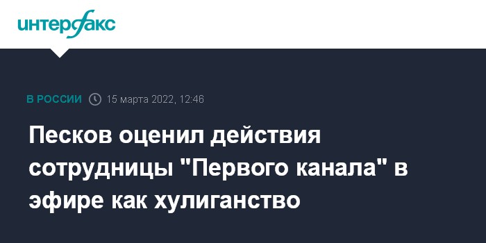 Москва. 15 марта. INTERFAX.RU - Пресс-секретарь президента РФ Дмитрий Песков назвал хулиганством действия сотрудницы Первого канала Марины Овсянниковой, появившейся в студии во время прямого эфира с пацифистским плакатом.