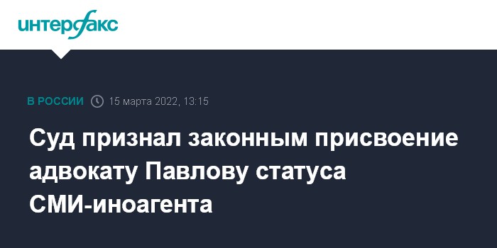 Москва. 15 марта. INTERFAX.RU - Замоскворецкий суд признал законным решение Минюста включить адвоката Ивана Павлова в реестр СМИ-иноагентов, иск Павлова, который это оспаривал, суд отклонил, сообщили "Интерфаксу" в суде.