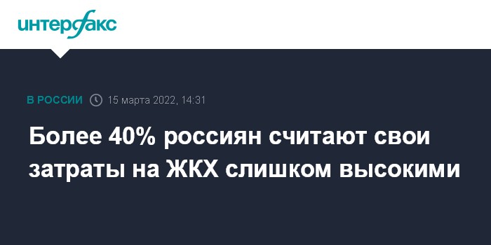 Москва. 15 марта. INTERFAX.RU - Около половины россиян (43%) считают, что несут слишком большие расходы на оплату услуг ЖКХ, свидетельствуют данные опроса Фонда "Общественное мнение" (ФОМ), поступившие во вторник в "Интерфакс".