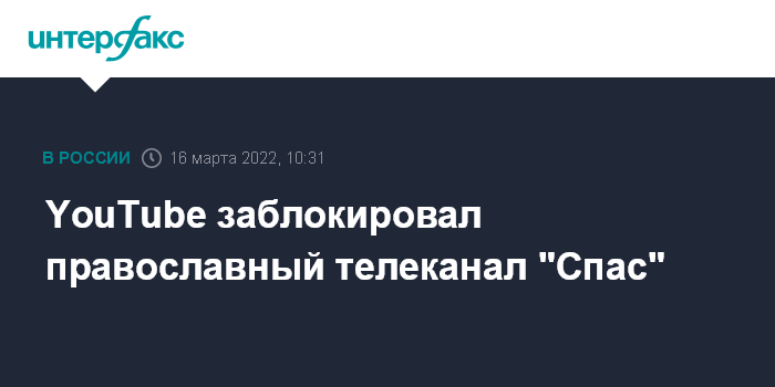 Москва. 16 марта. INTERFAX.RU - Православный телеканал "Спас" сообщил о блокировке своего канала на YouTube и о переходе в связи с этим на видеохостинг Rutube.