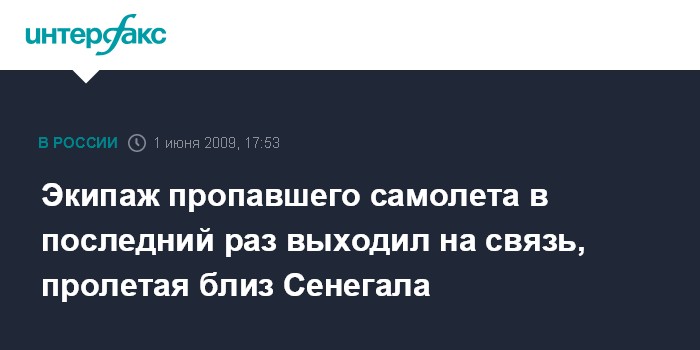Москва. 1 июня. INTERFAX.RU - Пассажирский авиалайнер Airbus-330 авиакомпании Air France, исчезнувший над Атлантикой, в последний раз выходил на связь с бразильскими авиадиспетчерами, пролетая недалеко от Сенегала, информирует в понедельник агентство ЭФЭ. Командование ВВС Бразилии сообщило в коммюнике, что экипаж связался с диспетчерами в момент, когда самолет собирался войти в воздушное пространство Сенегала.
