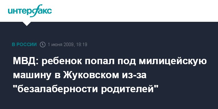 Москва. 1 июня. ИНТЕРФАКС - К дорожно-транспортному происшествию, в результате которого служебная машина вневедомственной охраны в подмосковном Жуковском по случайности сбила шестилетнего мальчика, привела безалаберность его родителей, считают в МВД РФ.