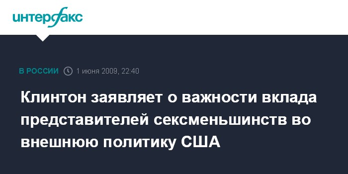 "По случаю месячника гордости геев и лесбиянок от имени госдепартамента я воздаю должное сообществу геев, лесбиянок, бисексуалов и транссексуалов за прошедшие 40 лет борьбы за свои права и предлагаю нашу поддержку в важной работе, которая еще предстоит" - говорится в заявлении Х.Клинтон.
