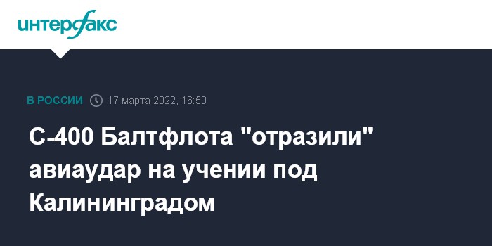Москва. 17 марта. INTERFAX.RU - Зенитные системы С-400 "Триумф" приняли участие в учениях Балтфлота по отражению налета авиации "противника" и успешно уничтожили его самолеты, сообщили в пресс-службе Балтфлота.