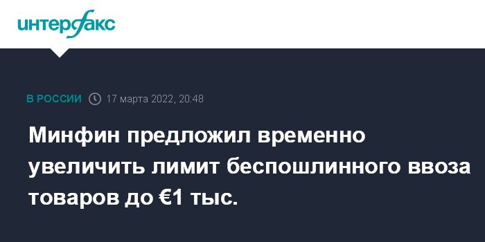 Москва. 17 марта. INTERFAX.RU - Минфин РФ подготовил предложение об увеличении лимита беспошлинного ввоза товаров в рамках электронной торговли для физических лиц с 200 евро до 1 тысячи евро на период до 1 октября 2022 года, сообщили "Интерфаксу" в министерстве.