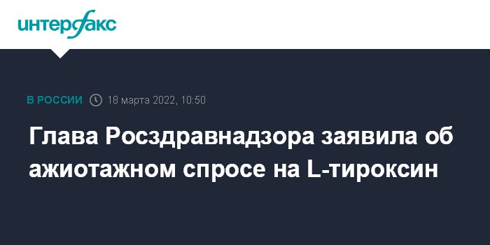 Москва. 18 марта. INTERFAX.RU - В России нет дефицита препарата для лечения заболевания щитовидной железы L-тироксин, но сейчас на него в начале марта сложился ажиотажный спрос, заявила телеканалу "Россия 24" глава Росздравнадзора Алла Самойлова.