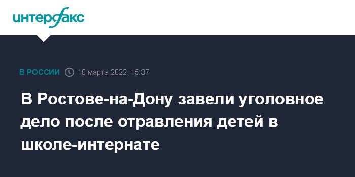 16 марта у 17 воспитанников санаторной школы-интернат Ростова-на-Дону в возрасте от 7 до 15 лет резко ухудшилось состояние здоровья после того, как они поели. У них появились симптомы отравления в виде тошноты, диареи, рвоты и повышенной температуры. Все дети госпитализированы, их состояние оценивается как удовлетворительное.