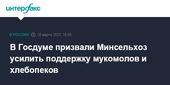Москва. 18 марта. INTERFAX.RU - Депутаты Госдумы предложили Минсельхозу расширить господдержку мукомолов и хлебопеков, а также разрешить им продавать хлеб без упаковки. Как сказала зампред думского комитета по аграрным вопросам Надежда Школкина, такое письмо направлено главе ведомства Дмитрию Патрушеву.
