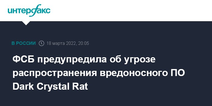 Москва. 18 марта. INTERFAX.RU - Созданный по решению руководства ФСБ Национальный координационный центр по компьютерным инцидентам (НКЦКИ) предупредил о кампании киберпреступников, направленной на внедрение вредоносного программного обеспечения (ВПО) Dark Crystal Rat в информационные системы российских организаций.