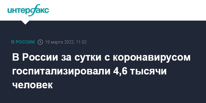 Москва. 19 марта. INTERFAX.RU - В России за сутки в больницы попали 4 564 пациента с коронавирусом, следует из данных оперативного штаба, обнародованных в субботу.
