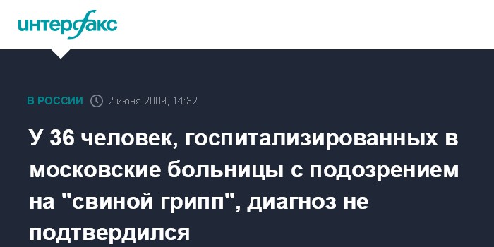 Москва. 2 июня. INTERFAX.RU - 36 человек, прилетевшие за последние две недели в Москву из тех стран, где зафиксирована вспышка "свиного гриппа", были госпитализированы с подозрением на это заболевание, сообщил "Интерфаксу" во вторник источник в медицинских кругах столицы. Он рассказал, что у них вирус калифорнийского гриппа A/H1N1 не был выявлен.