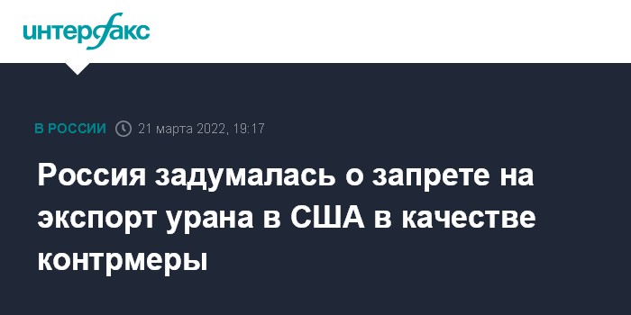 Москва. 21 марта. INTERFAX.RU - Россия изучает возможность запрета на экспорт урана в США в качестве составляющей ответного пакета санкций, сообщил вице-премьер РФ Александр Новак в ходе встречи с фракцией ЛДПР.
