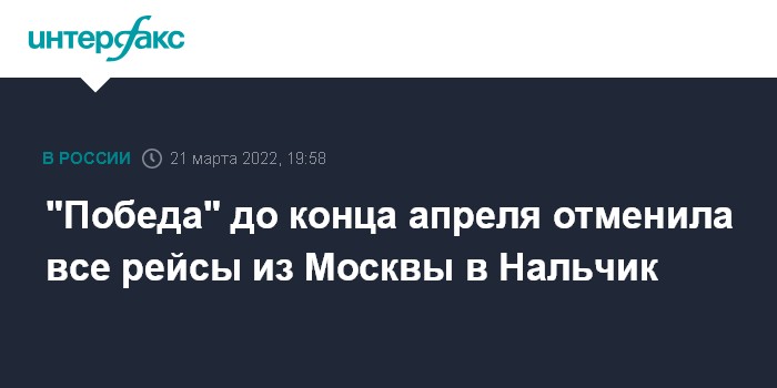 Москва. 21 марта. INTERFAX.RU - Авиакомпания "Победа" отменила до 30 апреля все рейсы из Москвы в аэропорт "Нальчик" (Кабардино-Балкария), сообщается в телеграм-канале аэропорта.