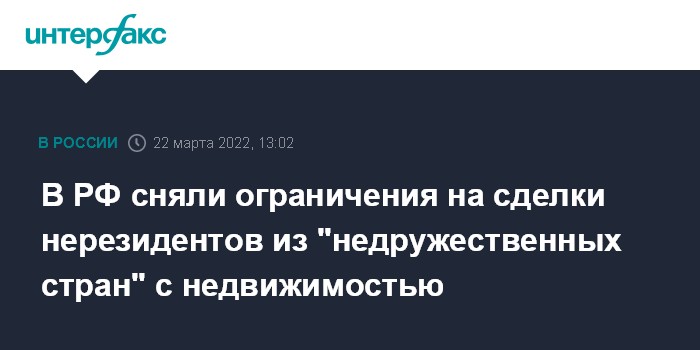 Москва. 22 марта. INTERFAX.RU - Власти РФ сняли ограничения на сделки нерезидентов из "недружественных стран" с недвижимостью, введенные в начале марта.