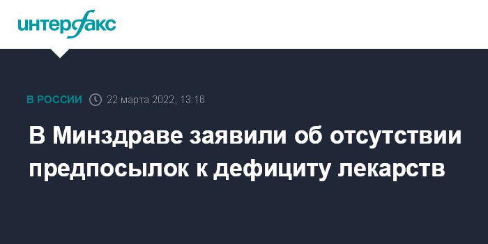 Москва. 22 марта. INTERFAX.RU - В России в настоящее время нет дефицита лекарственных препаратов и предпосылок к нему; производство и поставки жизненно важных препаратов продолжаются, сообщили "Интерфаксу" в Минздраве России.