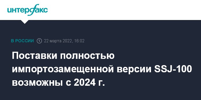Москва. 22 марта. INTERFAX.RU - РФ может обеспечить поставки самолётов SSJ-100 в 2022 году в количестве 19, не считая тех, что не были ранее реализованы заказчиком. Поставки полностью импортозамещенной версии самолёта возможны с 2024 года.