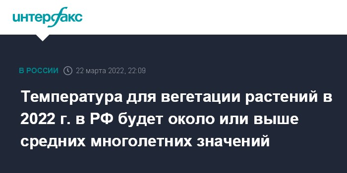 Москва. 22 марта. INTERFAX.RU - Температурный режим для вегетации растений в апреле-сентябре 2022 года на большей части территории РФ будет выше или около средних многолетних значений, сообщает Гидрометцентр.