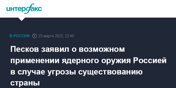 Москва. 22 марта. INTERFAX.RU - Россия может применить ядерное оружие в случае, если будет угроза существованию страны, заявил пресс-секретарь президента РФ Дмитрий Песков.