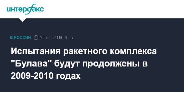 Москва. 2 июня. INTERFAX.RU - Ракетный комплекс "Булава" жизнеспособен, его испытания будут продолжены в 2009 и 2010 годах, сообщил журналистам в Москве вице-премьер Сергей Иванов. При этом он добавил, что испытания "Булавы" продолжатся в этом и следующем годах.