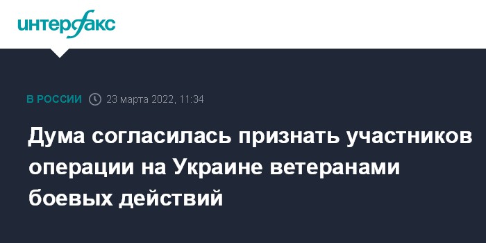 Москва. 23 марта. INTERFAX.RU - Государственная дума на пленарном заседании в среду приняла сразу в трех чтениях закон, по которому статус ветерана и инвалида боевых действий распространяется на тех, кто с 24 февраля выполняет задачи в ходе специальной военной операции на Украине.