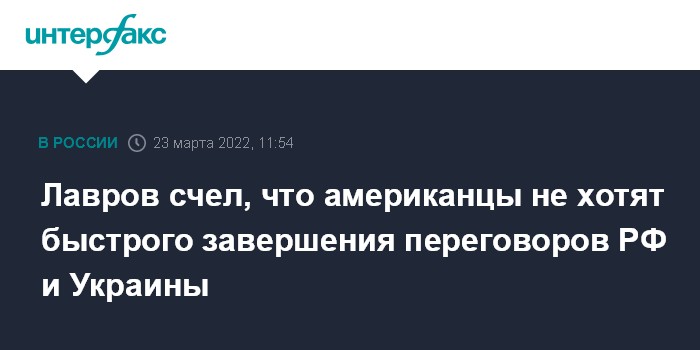 Москва. 23 марта. INTERFAX.RU - США не заинтересованы в быстром ходе переговоров России и Украины, хотят максимально долго держать стороны в состоянии боевых действий, заявил в среду глава МИД РФ Сергей Лавров.