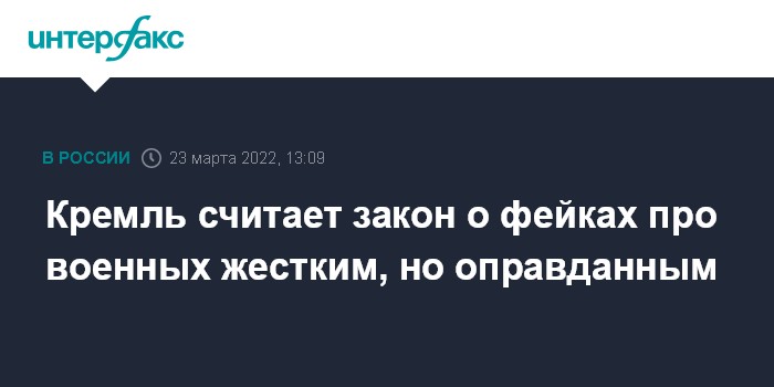 Москва. 23 марта. INTERFAX.RU - Новый закон об уголовной ответственности за "фейки" о российских военных и их дискредитацию жесткий, но он соответствует информационной войне, с которой сталкивается Россия, заявил на брифинге пресс-секретарь президента Дмитрий Песков.