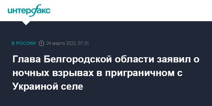 Москва. 24 марта. INTERFAX.RU - Несколько взрывов произошло в ночь на четверг в селе Журавлевка Белгородской области, где объявлен режим ЧС из-за попадания снаряда с территории Украины, заявил губернатор Вячеслав Гладков.