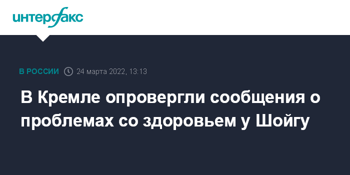 Москва. 24 марта. INTERFAX.RU - В Кремле опровергли сообщения СМИ о проблемах со здоровьем у министра обороны РФ Сергея Шойгу, а его отсутствие на публике объяснили вовлеченностью в командование спецоперацией на Украине.