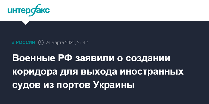 Москва. 24 марта. INTERFAX.RU - Минобороны РФ объявило о создании с 25 марта гуманитарного коридора для безопасного выхода иностранных судов из украинских портов.