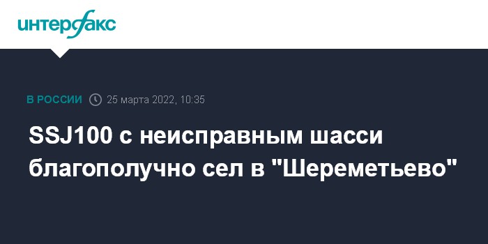 Москва. 25 марта. INTERFAX.RU - Sukhoi Superjet 100 с неисправным шасси приземлился в "Шереметьево", посадка прошла благополучно, никто не пострадал, сообщил "Интерфаксу" информированный источник.