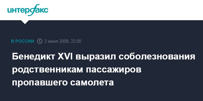 Ватикан. 2 июня. INTERFAX.RU - Папа римский Бенедикт XVI выразил во вторник соболезнования родным и близким пассажиров и членов экипажа самолета французской авиакомпании Air France, пропавшего над Атлантическим океаном, сообщило радио Ватикана.