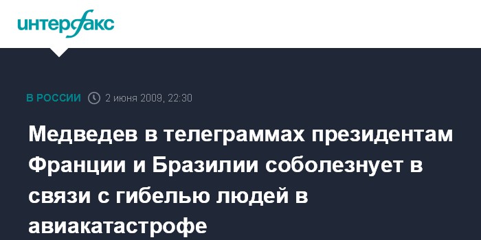 Медведев в телеграммах президентам Франции и Бразилии соболезнует в связи с гибелью людей в авиакатастрофе