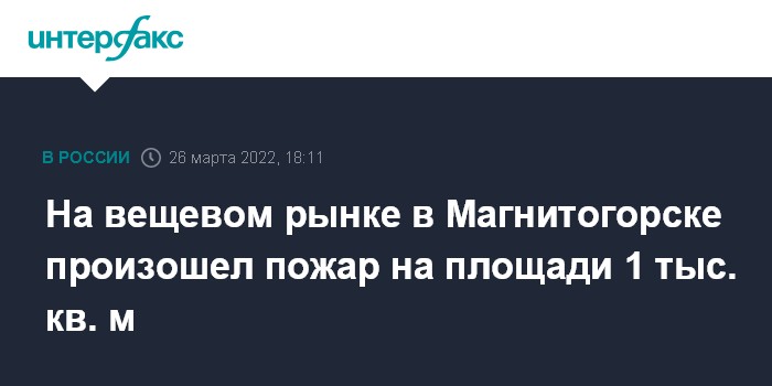 Москва. 26 марта. INTERFAX.RU - Крупный пожар возник в субботу на вещевом рынке в Магнитогорске (Челябинская область), сообщает пресс-служба МЧС.