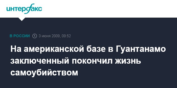 Москва. 3 июня. INTERFAX.RU - Гражданин Йемена, содержавшийся в центре задержаний на американской базе в Гуантанамо (Куба) скончался, предположительно, в результате самоубийства, сообщает в среду американская телекомпания Си-Эн-Эн со ссылкой на заявление представителей Пентагона.