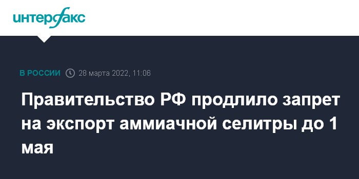 Запрет на вывоз аммиачной селитры был введен 2 февраля и должен был действовать до 2 апреля. В Минпромторге РФ тогда отмечали, что решение не окажет серьезного влияния на общий объем экспорта аммиачной селитры, установленный в рамках квоты (действует с 1 декабря 2021 года по 31 мая 2022 года.). Выделенная квота составляет 744 тыс. тонн, из которых на конец января было экспортировано 370 тыс. тонн.