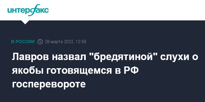 Москва. 28 марта. INTERFAX.RU - Сообщения о том, что в России может готовиться государственный переворот, а также о "пропаже" министра обороны РФ Сергея Шойгу, являются ложью и "бредятиной", заявил глава МИД РФ Сергей Лавров.