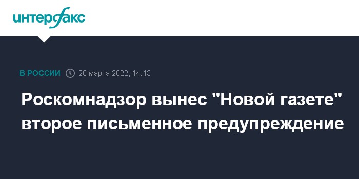 22 марта Роскомнадзор уже направлял письменное предупреждение редакции и учредителю "Новой газеты" за отсутствие маркировки при упоминании некоммерческой организации, выполняющей функции иностранного агента.