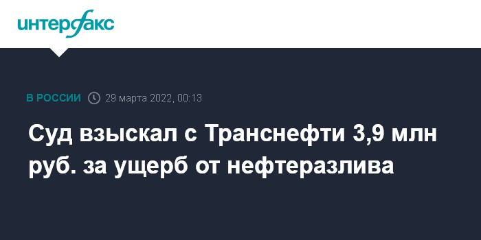 Москва. 29 марта. INTERFAX.RU - Арбитражный суд Самарской области удовлетворил требование Росприроднадзора о взыскании с АО "Транснефть-Приволга" (входит в "Транснефть" ) 3,859 млн рублей ущерба окружающей среде, причиненного разливом нефти из нефтепровода Куйбышев-Тихорецк, следует из картотеки арбитражных дел.