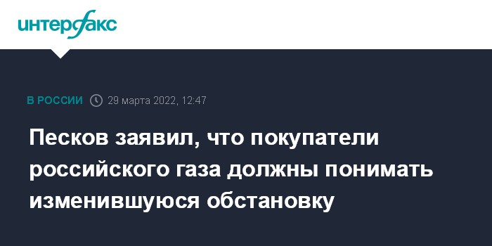 Москва. 29 марта. INTERFAX.RU - Компании, закупающие российский газ в Европе, должны исходить из сложившейся конъюнктуры и изменившейся обстановки в мире в ответ на призыв стран "большой семерки" отказаться от расчетов в рублях за получаемый газ, заявил пресс-секретарь президента РФ Дмитрий Песков.