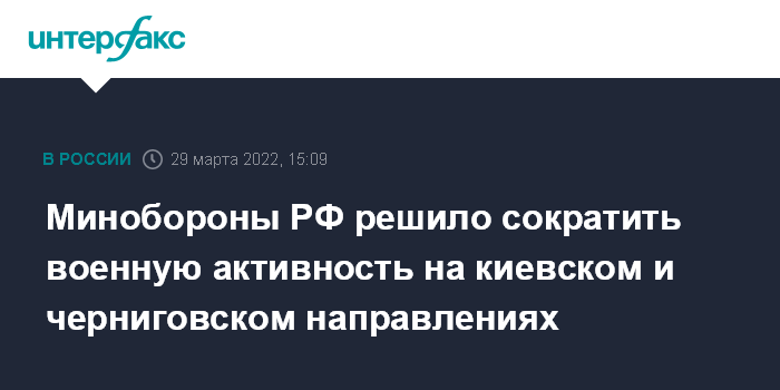 "В связи с тем, что переговоры по подготовке договора о нейтралитете и безъядерном статусе Украины, а также о предоставлении Украине гарантий безопасности переходят в практическую плоскость, с учетом обсужденных в ходе сегодняшней встречи принципов, министерством обороны Российской Федерации в целях повышения взаимного доверия и создания необходимых условий для дальнейшего ведения переговоров и достижения конечной цели согласования и подписания вышеуказанного договора, принято решение кардинально, в разы сократить военную активность на киевском и черниговском направлении", - сказал он.