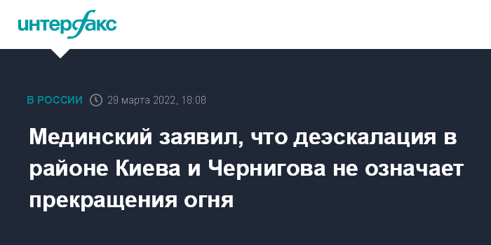 Москва. 29 марта. INTERFAX.RU - Глава российской делегации на переговорах с Киевом, помощник президента РФ Владимир Мединский заявил, что военная деэскалация на киевском и черниговском направлениях не означает прекращения огня.
