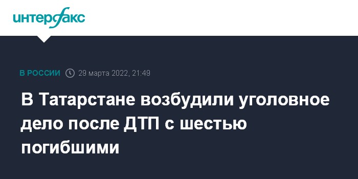 Москва. 29 марта. INTERFAX.RU - Следственные органы возбудили уголовное дело по двум статьям после автоаварии, в результате которой шесть человек погибли и еще один пострадал, сообщает пресс-служба следственного управления СКР по Татарстану во вторник.
