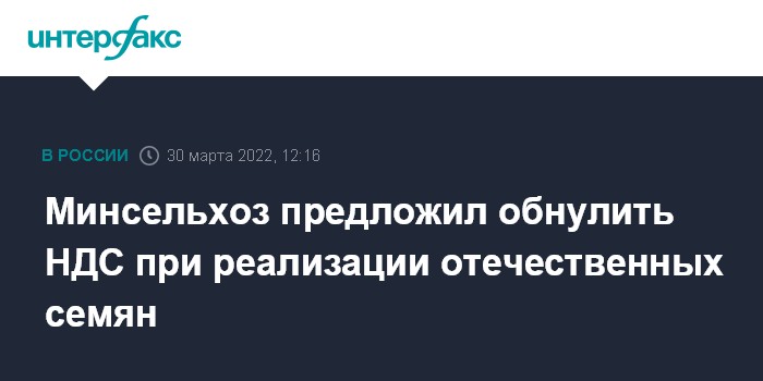 Москва. 30 марта. INTERFAX.RU - Минсельхоз РФ подготовил предложения по обнулению ставки НДС при реализации всех семян отечественной селекции. Об этом сообщил министр сельского хозяйства Дмитрий Патрушев на заседании комитета Госдумы по аграрным вопросам в среду.