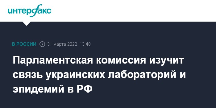 Москва. 31 марта. INTERFAX.RU - Парламентская комиссия, которая расследует деятельность биолабораторий на Украине, на заседании 4 апреля будет обсуждать, есть ли связь между работой этих лабораторий и возникавших в последние годы в России биологических и бактериологических угроз, сообщил вице-спикер Совета Федерации Константин Косачев.