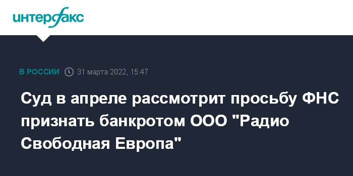 Москва. 31 марта. INTERFAX.RU - Арбитражный суд Москвы назначил на 15 апреля заседание по рассмотрению заявления инспекции Федеральной налоговой службы (№7 по Москве о признании несостоятельным ООО "Радио Свободная Европа/Радио Свобода" (признано властями СМИ-иноагентом) по упрощенной процедуре отсутствующего должника.