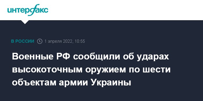 Москва. 1 апреля. INTERFAX.RU - Российские военные уничтожили шесть объектов армии Украины, в том числе склады с боеприпасами и горючим, сообщили в Минобороны РФ в пятницу.